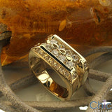 A superb mens ring with a high polished 11 mm wide heavy solid shank. AAA quality cubic zirconias in channel and pave setting.