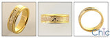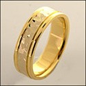 A unique high polished wedding band with yellow gold on the inside and sides of the face and white gold high polished texture on the outside center.
