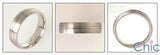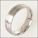 White gold sophisticated wedding band with brush metal look on the sides with a thin line of high polished striped in the center.