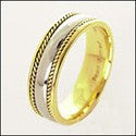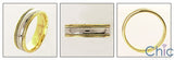 A high polished two tone wedding band with a white center and yellow engravings on the sides.