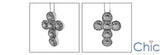 A unique cross pendant with circular edges, round AAA high quality cubic zirconias set in pave, and larger round stones set in bezel. 18 inch 14k white gold chain included.