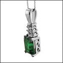 A lovely pendant with emerald color and cut AAA high quality cubic zirconia set in prong, has round small stones on top in prong as well. 18 inch 14k white gold chain included.