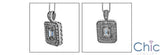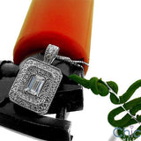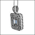 A marvelous pendant with an emerald cut center stone surrounded by round stones set in pave. 18 inch 14k white gold chain included.