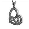 A heart shaped pendant with 2 heart shapes inside it, with round stones set in pave. 18 inch 14k white gold chain included.