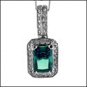 A lovely pendant with emerald color radiant cut AAA high quality cubic zirconia set in prong, round small stones on the sides set in pave. 16 inch 14k white gold chain included.