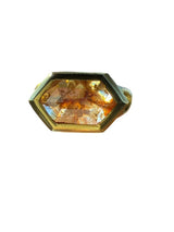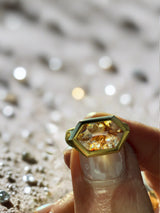 The geometric hexagon silhouette gives this piece architectural strength, while the rose cut creates a soft, candlelit glow rather than a sharp modern sparkle. Natural inclusions shimmer within the diamond like captured sunlight, making every angle uniquely alive.