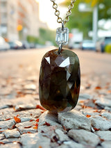 Timeless Depth – Rose Cut Diamond Talisman - Mysterious and refined, this unique pendant showcases a 3.0 carat natural rose cut diamond in rich brownish-gray tones, complemented by a luminous 0.15 carat emerald cut diamond. Set on a sleek 18-inch 14k yellow gold chain, the 16mm drop adds just the right touch of presence and grace.