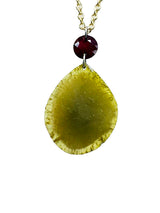 A pendant that speaks in symbols. Suspended from a 16-inch 14k gold chain, this one-of-a-kind talisman holds a glowing greenish slice of natural diamond—raw, elemental, and luminous like mossy sunlight. Above it rests a brilliant, round, natural ruby, pulsing with passion and protection.