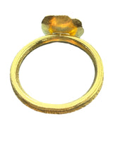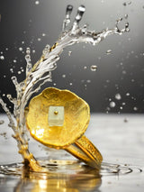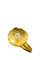 The Soloist is a handmade ring, formed in rich, luminous 22K gold, shaped into a softly textured platter that catches light like brushed sunlight. The contrast between the organic gold surface and the subtly textured shank creates depth — a quiet interplay of warmth and shadow.