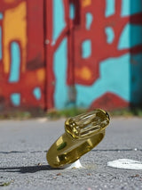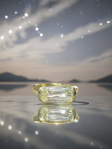 The diamond appears to float within a luscious 18k yellow gold half-bezel setting, offering both protection and openness. Elevated at 5.5mm in height, the setting gives the stone presence and air, while the approximately 3.75mm wide shank provides a sculptural balance and a comfortable, substantial feel on the hand. Every surface is hand-polished, every curve intentional.
