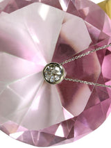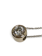 Elegant bezel set 2 carat AAA highest quality, IGI certified round cubic zirconia pendant. The height of the pendant is 7mm. The pendant has 2 openings for the chain to slide thru. The chain is 16 inches in length.