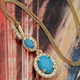 One of a kind elegant drop style pendant with Turquoise stones and high Quality round cubic zirconia halo with pave setting.The length of the pendant is 1.25 inches. The pave set bail included in the calculation. The top drop is 0.25 oval Turquoise, the bottom drop is 1.5 carat oval stone. The tiny pave set stones add an exquisite detail to this piece.Solid 14K Yellow Gold. Chain not included.