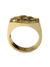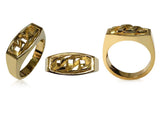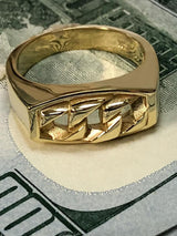 Cuban link ring has embedded 3 Cuban style links on top. The width of the band is 9 mm at the widest point on top. Great for men that are fond of Cuban link bracelets and chains. This will be an awesome addition to that collection.