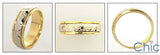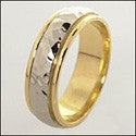 A unique high polished wedding band with high polished yellow gold on the sides and high polished textured white gold on the center.