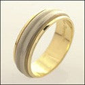 A high polished two tone wedding band with intricate engravings on the sides and a high polished center with a minor concave.