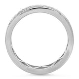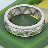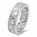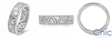 This masculine wedding band is made in 7.0 mm width. This unique piece has triangular style symbols going all the way around the wedding band in the eternity style format. The wedding band also has miligreed edges all through out the band. It is made in solid 14K white gold. "14K" stamp is inscribed. Heavy solid shank.