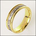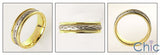 A high polished two tone wedding band with a white braded center and yellow engravings on the sides.