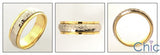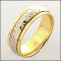 A unique high polished wedding band with high polished yellow gold on the sides and high polished textured white gold on the center.
