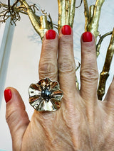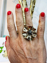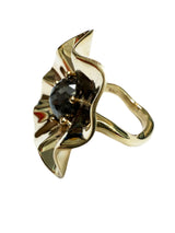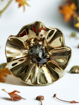 A sculptural statement ring featuring a 4-carat natural brown rose-cut diamond, set in solid 14k yellow gold. The organic floral form cradles the diamond like a bloom shaped by time and earth, highlighting its warm tone and soft, understated glow.
