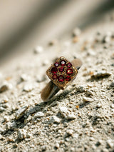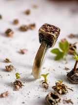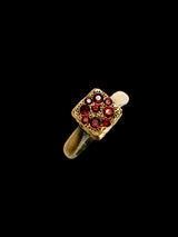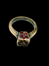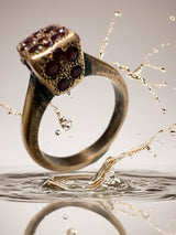 The square top is set with 0.65 total carats of natural rubies, each hand pavé–set in a non-symmetrical, organic flow. Rather than uniformity, the stones move instinctively across the surface, creating texture, depth, and the feeling of a relic shaped by history rather than precision. The rich crimson rubies glow like scattered embers against the darkened gold.