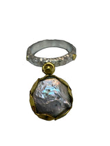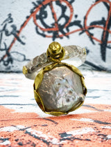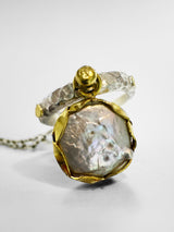 This artisan ring features a hand-textured 4mm sterling silver band paired with rich 22k gold accents. The center showcases a flat pearl wrapped in 22k gold. Designed with a kinetic element, the pearl rotates 360° around its vertical post, creating a unique interactive detail.