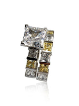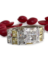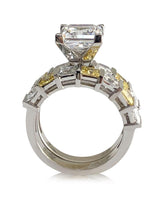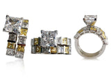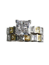 A real show stopper engagement ring with matching wedding ban., This AAA highest quality IGI certified cubic zirconia is showcasing a 3 carat princess cut center ,It is set in V prong setting. The sides are set with alternating canary and diamond cz smaller princess cut stones in channel setting. This piece is not sold separately.