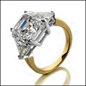 An elegant attraCt ive three-stone ring with two tone high polished solid shank, with asscher cut AAA quality cubic zirconia center stone set in prong, and with trillion cut high quality diamond color cubic zirconia stones set in prong on the sides.