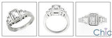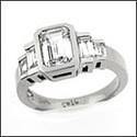 A unique ring with emerald cut center cubic zirconia in a bezel setting with baguette cubic zirconias in channel settings on the side.