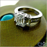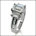 Elegant anniversary ring with AAA high quality emerald cut stones in prong setting, Sides have channel set baguettes.