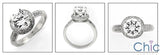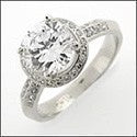 A unique ring with a stunning two carat round cubic zirconia in a prong setting with round cubic zirconias set in pave around and on the sides. Settings guaranteed for life