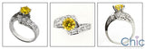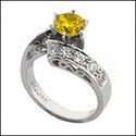 An exquisite anniversary ring with contoured shank with a round canary colored high quality cubic zirconia in a six prong tiffany style setting and white round cubic zirconias in pave setting on the sides.