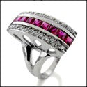 Eye-catching anniversary ring covered with round and ruby color princess cut stones in channel and prong setting combination. Split shank .1 inch in length, and 10mm in width.