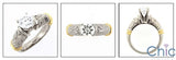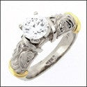 A two tone engraved solid shank ring with high quality round cubic zirconias in the center in four prong setting.