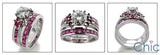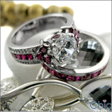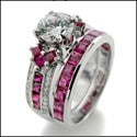 Exquisite design, set with AAA high quality round center stone, sides have combination of diamond color pave and ruby color princess cut stones. Front and back view has a small burnished round stone. Heavy shank.Matching band has ruby color channel set stones.