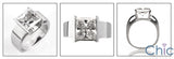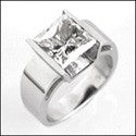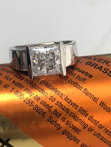 Unique chic design ring with high polished heavy shank and princess cut center cubic zirconia in channel setting.