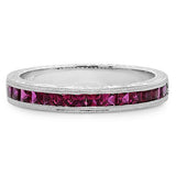 This gorgeous wedding band is showcasing IGI Certified AAA high quality Ruby color princess cuts. The princess cut cubic zirconia are set in channel setting. The setting is made in solid 14K white gold. The hand made engraving adds a great amount of detail and makes the piece one of a kind.