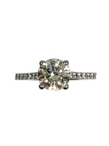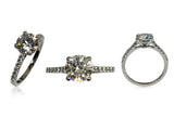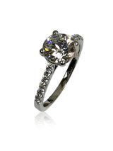 Classy engagement ring with 1.5 carat AAA high quality,lGI certified round Cubic Zirconia center stone. The center stone is set in low profile 4 prong basket. The sides are set with pave set small round cz stones, 7 stones on each side of the ring. The width of the shank is 1.7 wide.