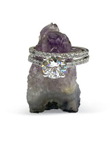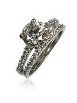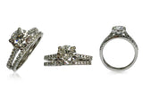 Classy engagement ring and wedding band matching set. This style has 1.5 carat AAA high quality,lGI certified round Cubic Zirconia center stone. The center stone is set in low profile 4 prong basket. The sides are set with pave set small round cz stones, 7 stones on each side of the ring. The width of the shank is 1.7 wide. The wedding band has matching pave set stones as well.
