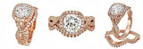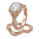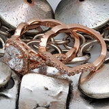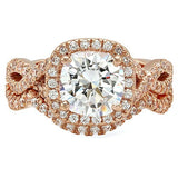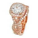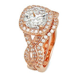 This 2.5 carat brilliant cushion cut cubic zirconia engagement ring and fitted matching band are made in solid 14K Rose gold. The 2.5 carat CZ has AAA High Quality and Is certified by IGI. The center cubic zirconia is set in 4 prongs and is surrounded by beautiful halo. The halo as well as the bands are set with round small pave set stones. The engagement ring's sides have eternity symbol, again topped with small round cz in pave. The wedding band is made to match and fit snug with engagement ring.