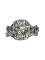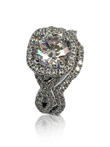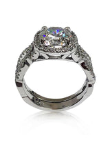2.5 carat brilliant cushion cut cubic zirconia engagement ring and fitted matching band are made in solid 14K White Gold. The 2.5 carat CZ has AAA High Quality and is certified by IGI. The center cubic zirconia is set in 4 prongs and is surrounded by beautiful halo style setting. The halo as well as the bands are set with round small pave set stones. The engagement ring's sides have eternity symbol, again topped with small round cz in pave. The wedding band is made to match and fit snug with engagement ring.
