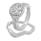 14k White Gold Bridal Ring and a matching fitted band is featuring an AAA High quality, IGI certified Round Center stone cubic zirconia. The cz is set in 4 prong setting. It is also surrounded by a beautiful halo. Halo is hand set with pave style small round stones.. The shank of the ring has eternity symbol that's also jeweled with pave set round stones. The matching band has the same contours as the engagement ring, hence its perfectly fitted.