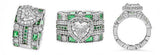 Fancy 2 carat AAA High Quality Cubic Zirconia Heart Shape Centered Engagement Ring with Art Deco Style Stacked Double Eternity Bands on each side.The 2 carat Heart Cubic Zirconia is set in a beautiful halo, the sides of the engagement ring are set with small round stones in three rows. Each eternity band has alternating emerald color baguettes and clear diamond round stones set in bezel setting.