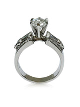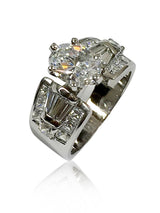 A classy engagement ring with a high polished solid shank and AAA high quality, IGI certified oval cubic zirconia center stone in Tiffany prong setting. The shank is set with round, princess, and tapered baguette shaped diamond cubic zirconias in prong channel setting on the sides.