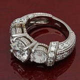 2 carat round brilliant cubic zirconia antique style ring. This anniversary antique design cubic zirconia ring is showcasing a 2 carat AAA high quality, IGI certified round center stone, immediate sides stones are 0.75 carat each round cz.. The stones are set in prongs setting.The shank is heavy and it is covered with engravings and etchings all over the ring. The sides are set with small round stones in pave setting.The carat's dimensions of our stones have the same exact dimensions as any natural ideal cut Diamonds.