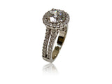 Gorgeous Engagement ring with a 2 carat round AAA highest quality, IGI certified cubic zirconia round center stone. The 2 carat brilliant cut stone is surrounded by pave set round small stones. The shank has a split of double rows of again pave set stones. The front and back view of the ring is displaying a beautiful small bezel set round stones which adds a nice detail to this piece.