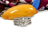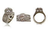Gorgeous Engagement ring and double matching bands. The engagement ring has a 2 carat round AAA highest quality, IGI certified cubic zirconia round center stone. The 2 carat brilliant cut stone is surrounded by pave set round small stones. The shank has a split of double rows of again pave set stones. The front and back view of the ring is displaying a beautiful small bezel set round stones which adds a nice detail to this piece. The matching wedding bands are set with small pave set stones as well and they sit flushed together with the engagement ring.