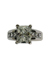 Eye catching 3 carat Radiant cut AAA high quality, IGI certified cubic zirconia engagement ring. Heavy solid shank. The 3 carat CZ is set in prong setting. The beautiful basket setting has a heart contour on the sides. The shank is set with princess cut stones in channel setting.