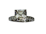 Finest Quality 3 Carat Asscher Cut Cubic Zirconia Engagement Ring The Asscher has AAA high quality and is IGI certified. It is set in Tiffany style 4 prong V shape setting. The shank is set with small round stone in share prong setting. Item 7197B will be a perfect match as a wedding band.