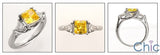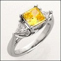 Classic three stone ring with high polished solid shank and princess cut canary color center and triangle cut side high quality cubic zirconias in prong setting.