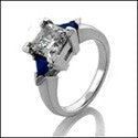 A lush three stone ring with a high polished solid shank, with a high quality princess cut center stone in a v prong setting, and a sapphire color triangle shaped stone on each side.